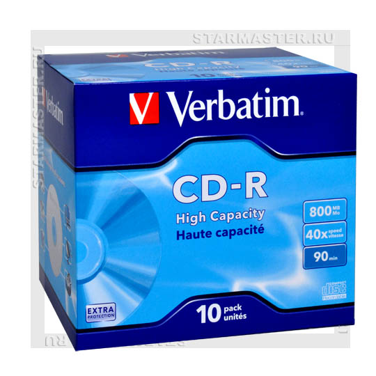 Диски CD-R Verbatim однократной записи, увеличенного объема 800Мб (90 минут CD-audio). На данную болванку поместится на 100Мб больше информации, чем на обычную CD-R болванку. Для записи информации свыше стандартных 700Mb, необходимо в программе записи включить режим перепрожига (Overburn).