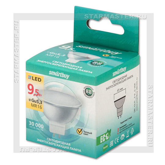 Каталог > Светотехника Светодиодная лампа GU5.3 220V 9.5W ~85Вт 3000K, SmartBuy LED MR16