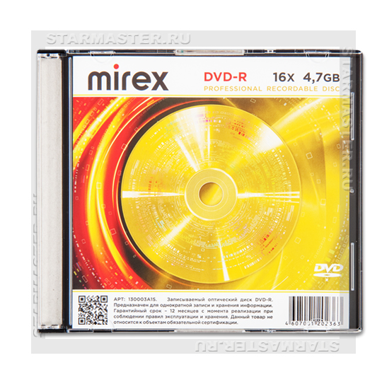 Диски DVD-R Mirex однократной записи. Объем записываемой на болванку информации - до 4,7Гб (120 минут видео в DVD-формате). Болванки DVD-R предпочтительнее использовать чем DVD+R, когда необходима максимальная совместимость со старыми DVD-плеерами (для современной техники DVD-R или DVD+R значения не имеет).