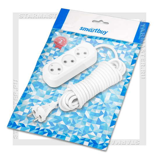 Каталог > Электрика > Удлинитель сетевой 220V SmartBuy 3 розетки, 5м без заземления, 10A ПВС 2х1,0