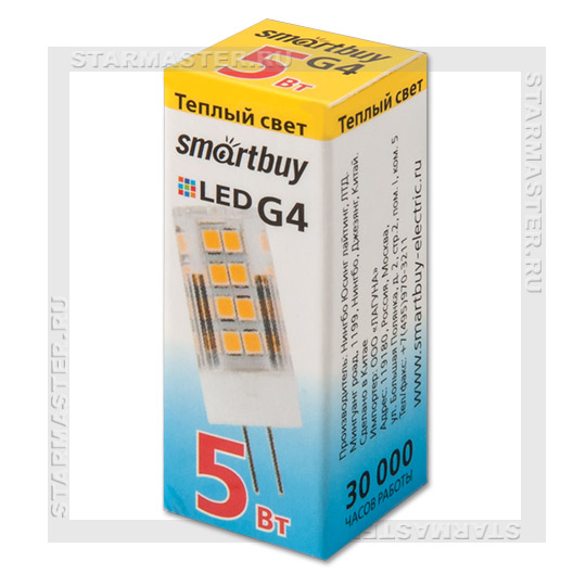 Светодиодная лампа SmartBuy 5W (цоколь G4) теплый свет 3000K, 220V